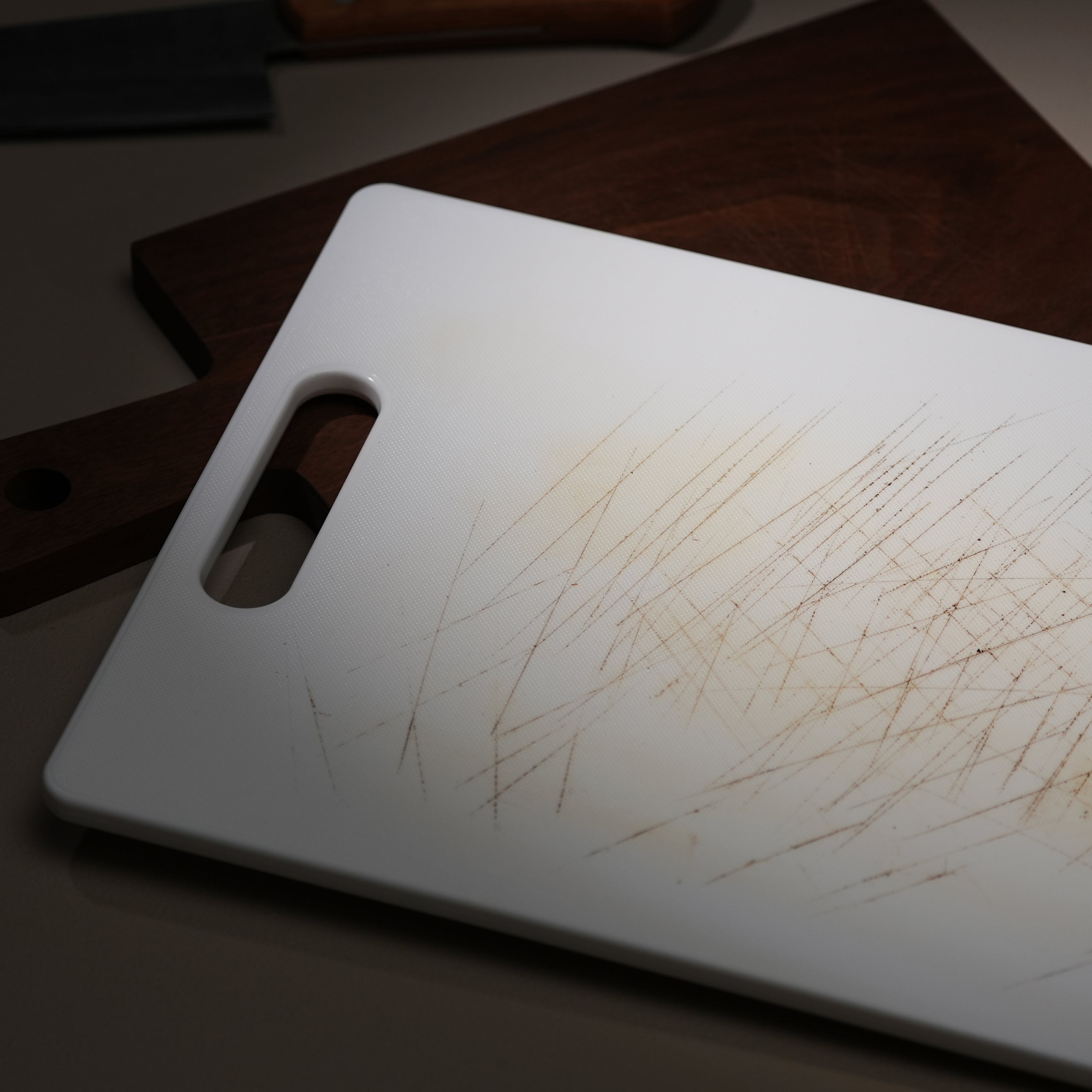 木は刃にやさしいけれど、すぐ黒ずんで手入れが大変。プラスチックは衛生的だけれど、硬くて刃こぼれしやすい。エラストマーは柔らかすぎて滑りやすい。